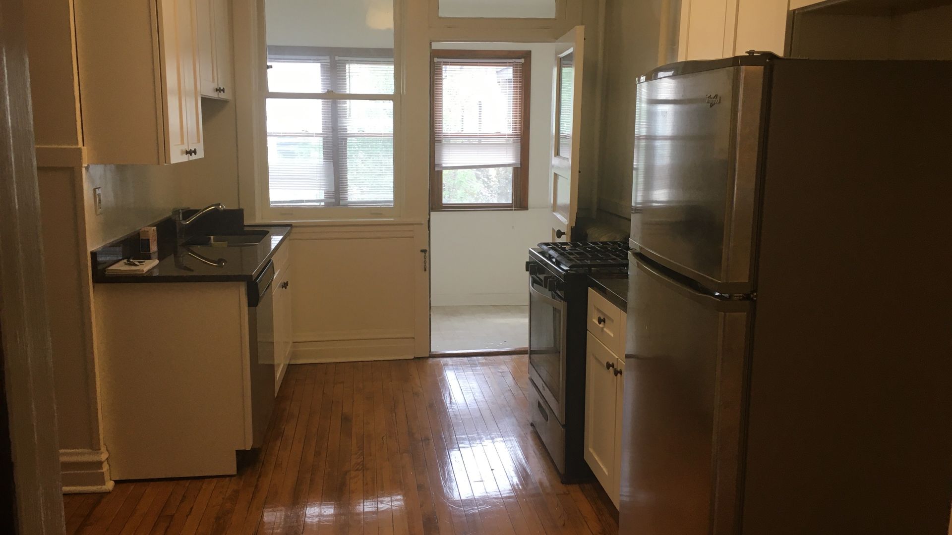 New granite kitchen countertops and stainless steel appliances (including a dishwasher), hardwood floors, big closets, huge kitchen with pantry, enclosed sun-porch, beautiful varnished wood throughout.